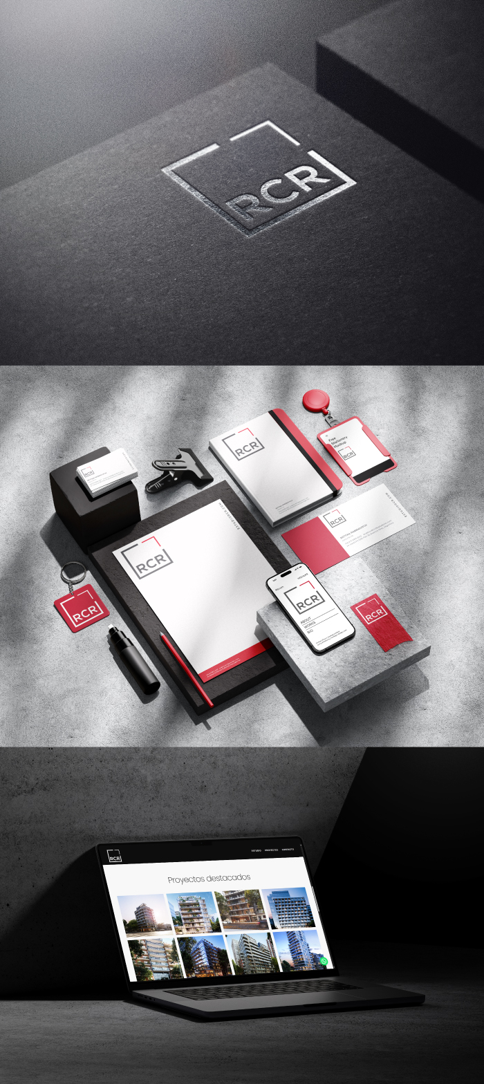 Creamos la identidad visual de RCR, estudio de arquitectura con más de 15 años de trayectoria y 120.000 m² construidos, buscando reflejar su experiencia, precisión y solidez profesional. Desarrollamos un sistema de marca sobrio y contemporáneo, donde el logo y sus aplicaciones transmiten orden, estructura y confianza. La propuesta visual acompaña la escala de sus proyectos y consolida una identidad clara, coherente y atemporal, pensada para comunicar profesionalismo y respaldo en cada punto de contacto.